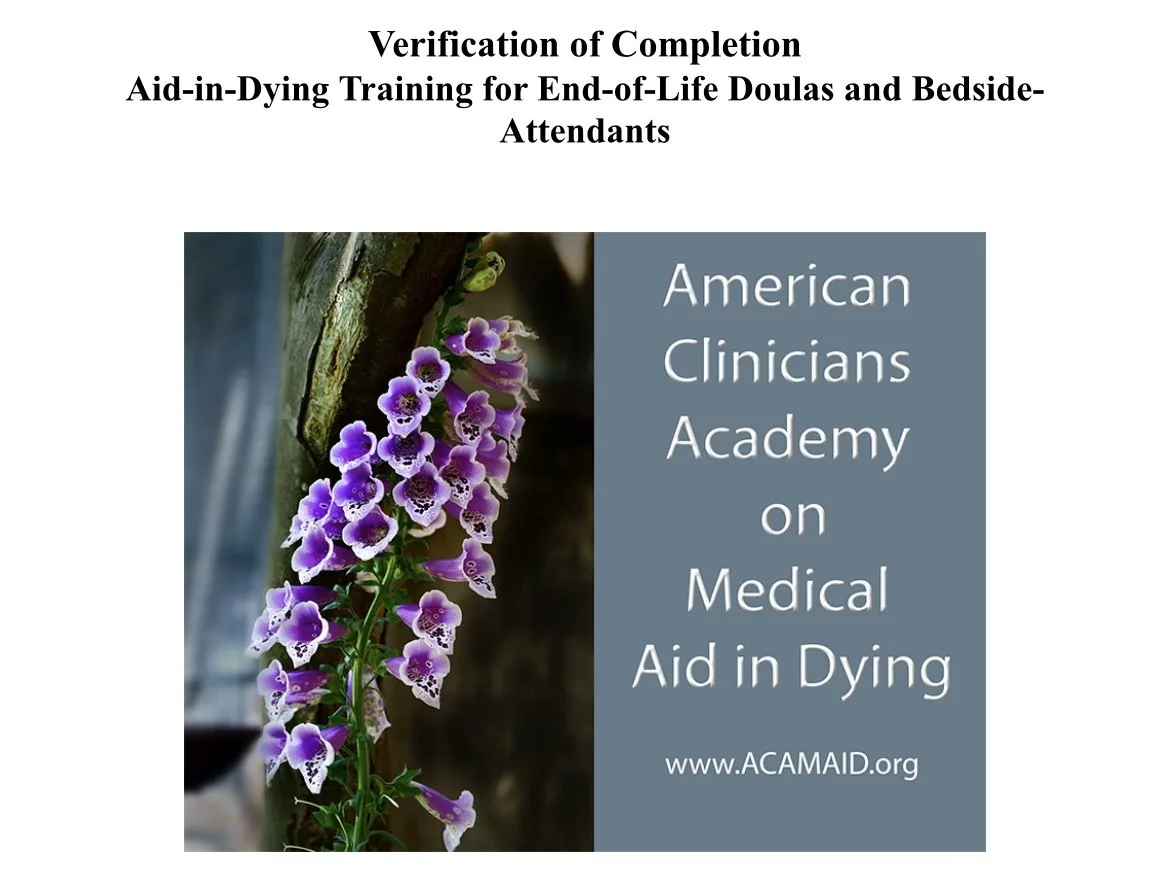 I hold a special place in my practice and heart for those choosing MAID (Medical Aid In Dying) as a means of Death with Dignity. For MAID, my travel area is greatly increased. I expanded beyond the comprehensive teaching included in my apprenticeship to be verified as an attendant by the American Clinicians Academy on Medical Aid in Dying. If you (or a dear one) are outside my area, but are choosing MAID, please feel free to schedule a consultation for Hands On Death Midwifery. I will work with you whenever possible, and attempt to refer you to another Death Worker if necessary.